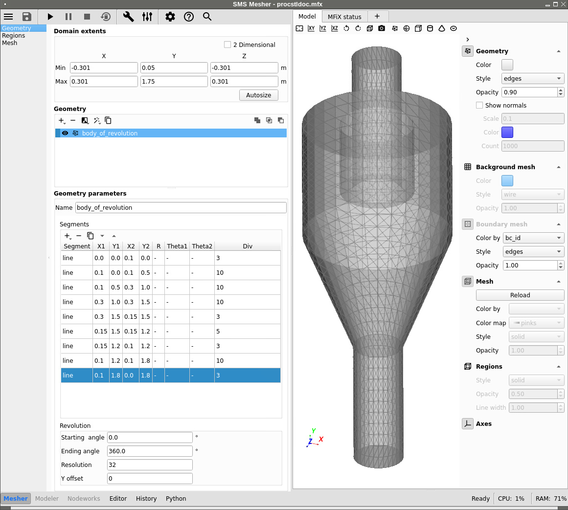 For complex shapes, it may be useful to align the view in the xy plane, set the ending angle to a small value (say 5 degrees) and set the style to wire with a black color. This allows to get a better view of the profile (see figure below). Once the profile is properly defined, set the ending angle to 360 degrees to generate the full 3D shape.