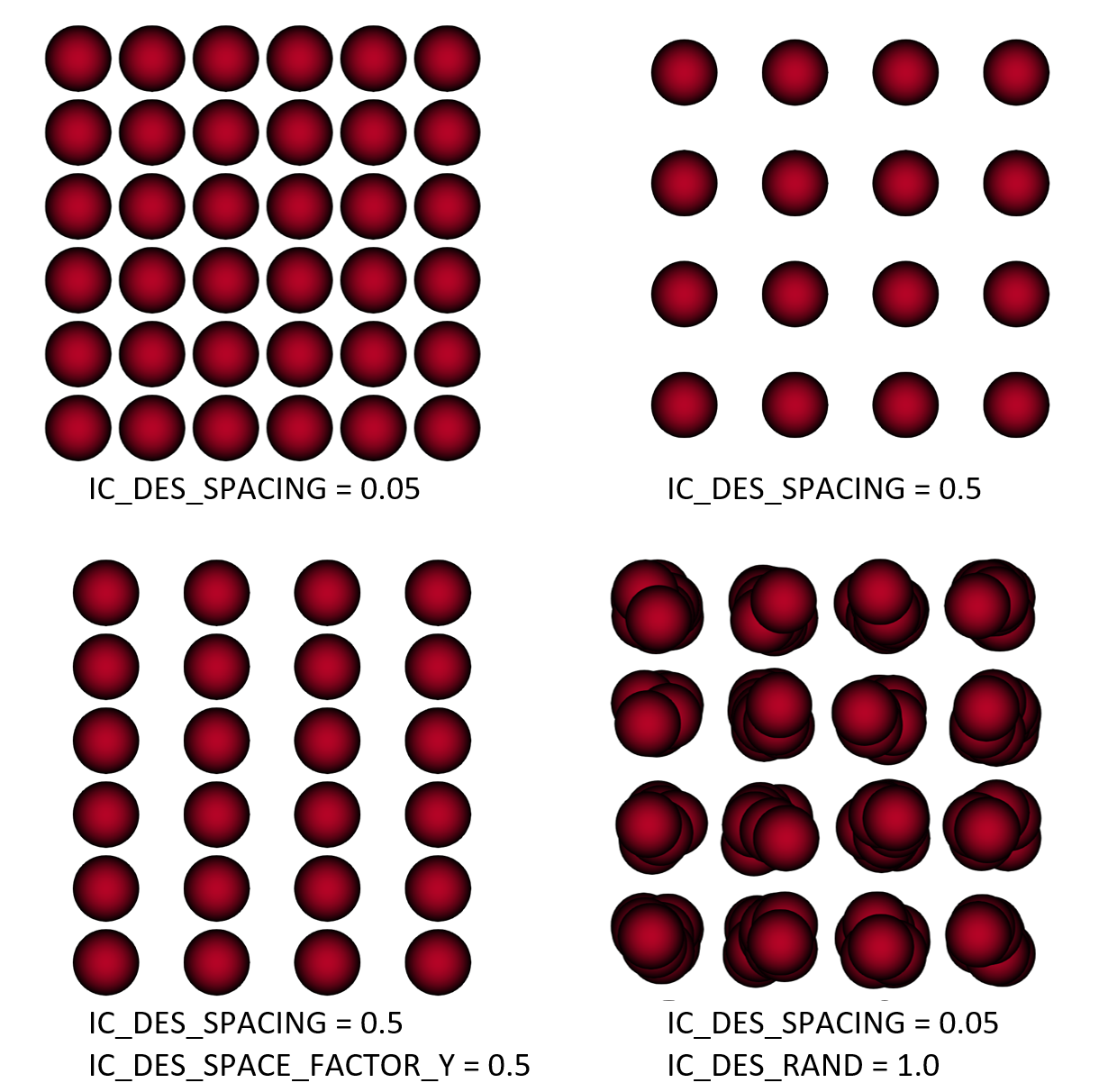 Spacing between particle (DEM solids only) Spacing (expressed as a fraction of the largest diameter, must be between zero and 1) between particles in the lattice. Default value is 0.05 (5% of the particle diameter). This spacing applies equally in all directions unless one of the spacing factors (x,y, or z direction) is less than one.