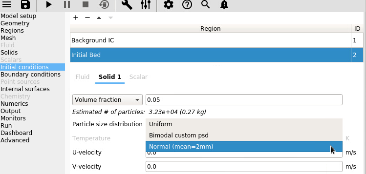 Particle size distribution (DEM solids only) Particle size distribution in the initial condition region. This can be left as “Uniform” (default) and the particle diameter (d_p0) defined in the Solids>Material pane will be used. If a PSD was defined in the Solids>DEM pane, it can be chosen here to initialize particles in this region with a PSD.