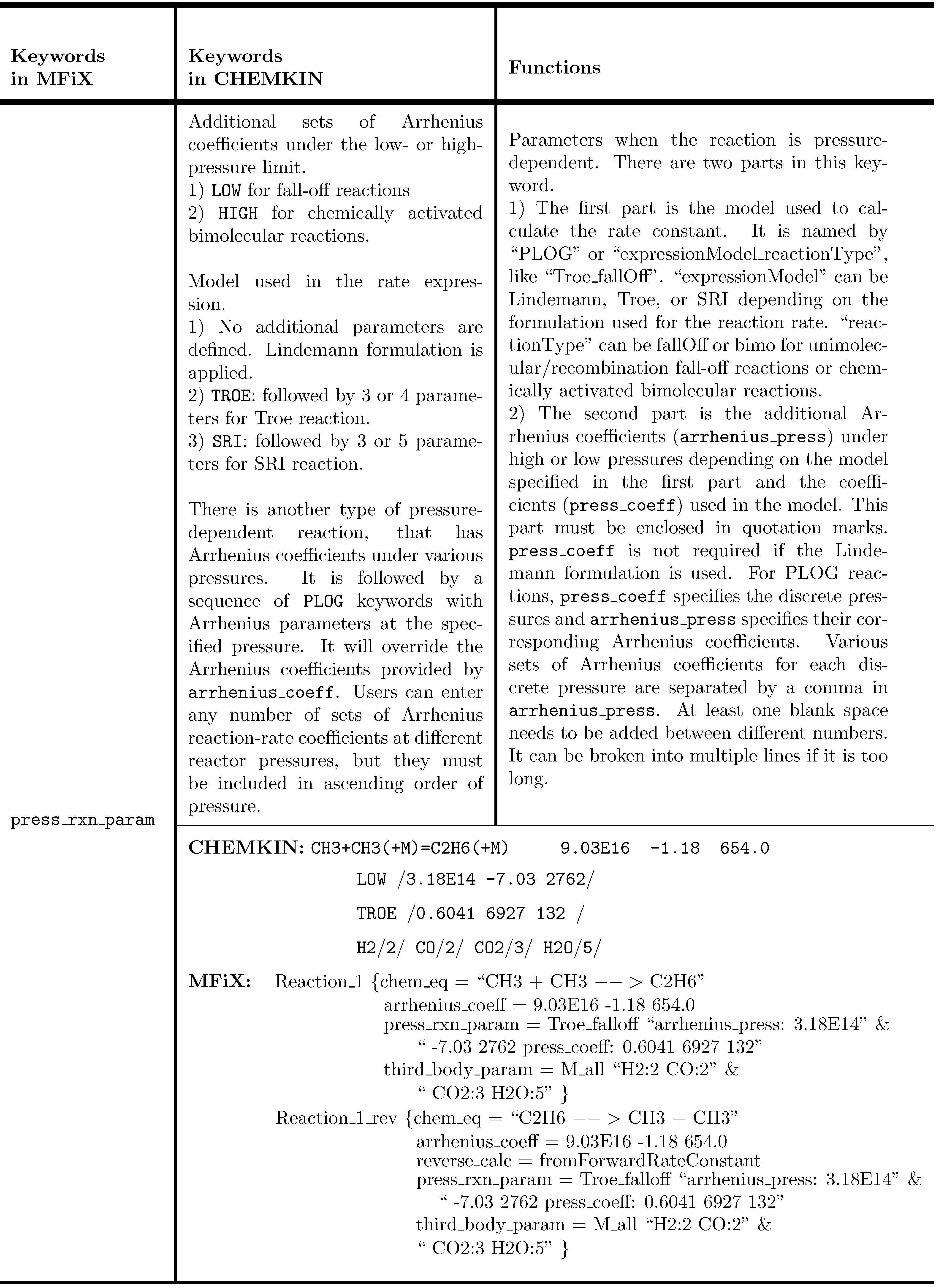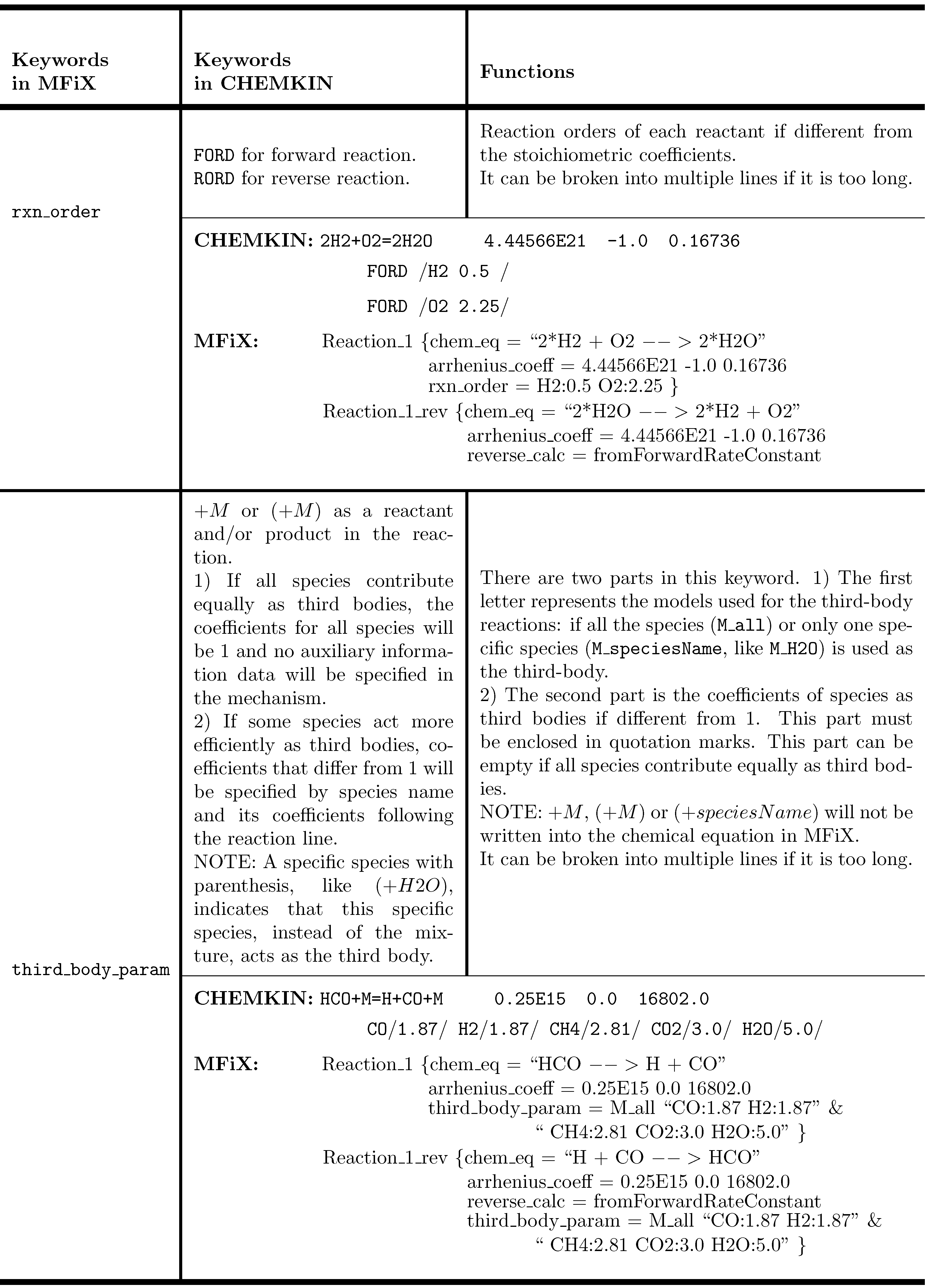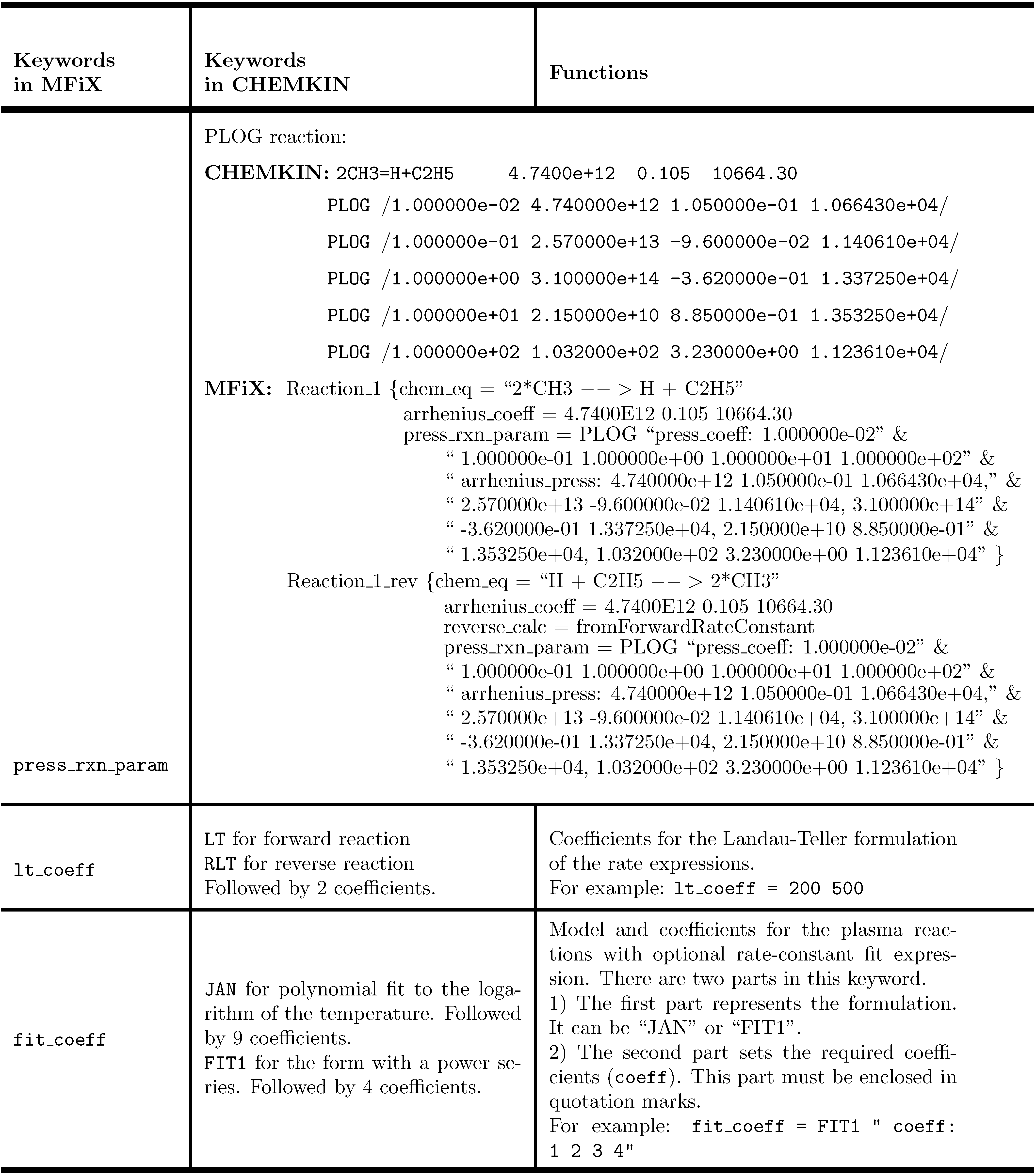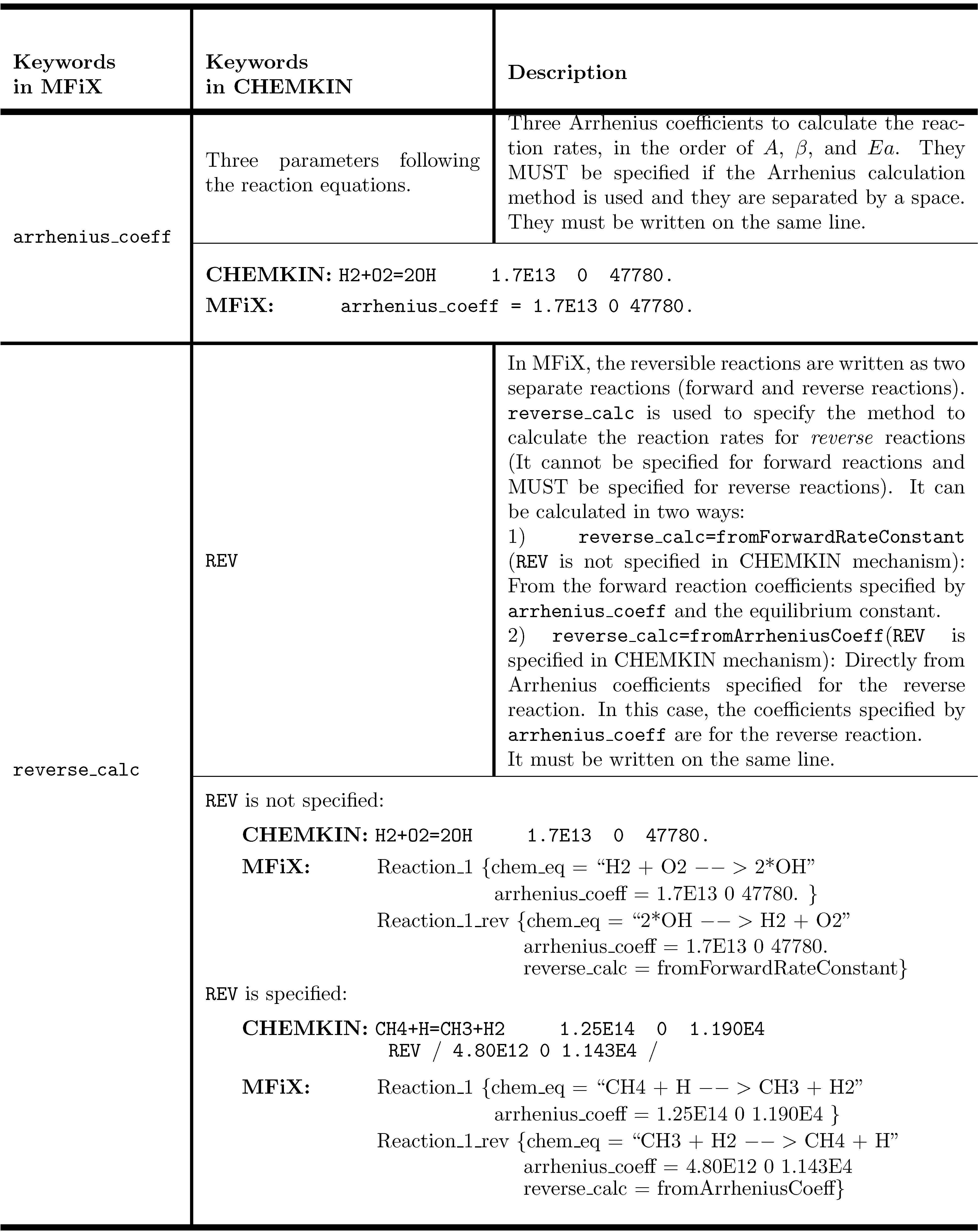 Figure 4.15 summarizes the required keywords and format used in MFiX for various types of reactions used in the CHEMKIN mechanism.