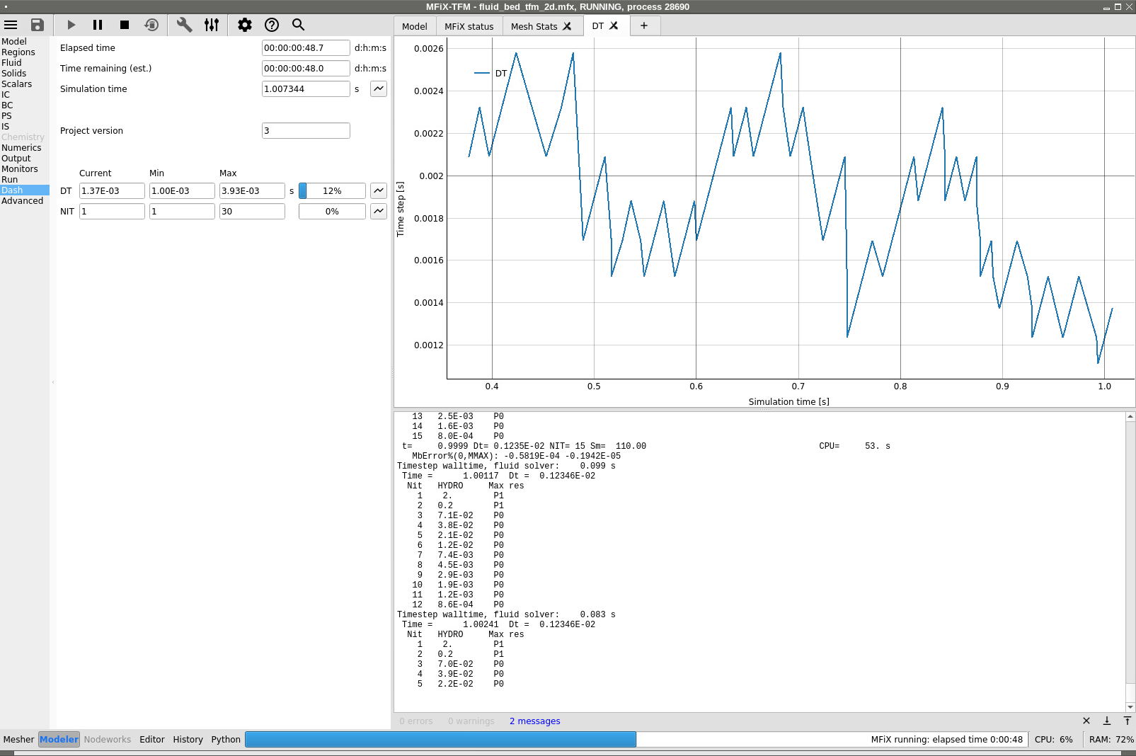 The MFiX Interactive Solver can interact with the GUI through http communication while the solver is running. Information about the flow solution can be passed directly from the solver to the GUI. For example, the simulation status, current simulation time, time step and residual information is communicated directly to the GUI, which can display or plot this information. The Dashboard view summarizes the progress of the simulation.