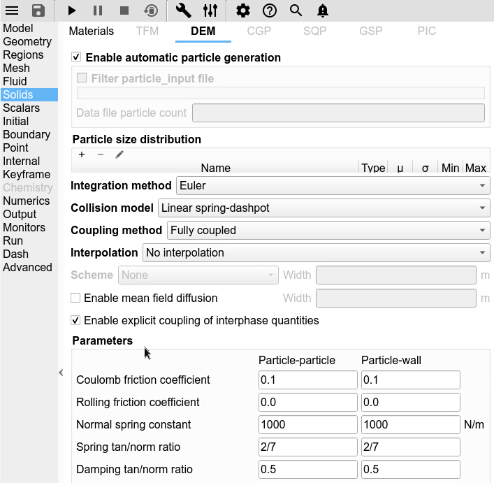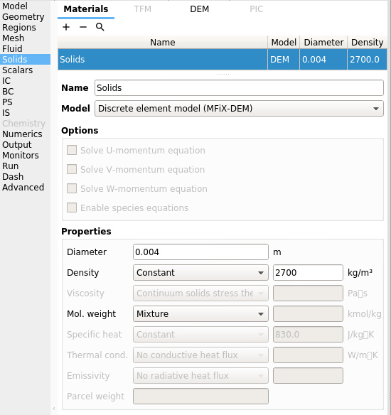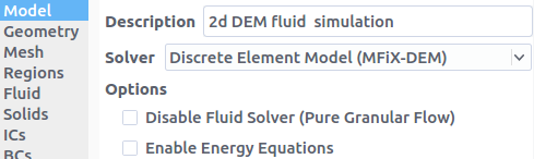 Modelpane, enter a descriptive text in theDescriptionfieldSelect “Discrete Element Model (MFiX-DEM)” in the