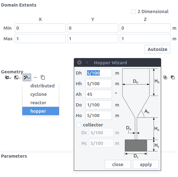 This tutorial shows how to create a three dimensional granular flow DEM simulation. The model setup is:
