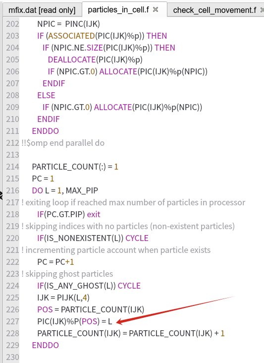 But when I commented out ‘CALL CHECK_CELL_MOVEMENT’ on line 189 in the particles_in_cell.f file, the particles don’t seem to disappear. But this requires turning off ‘re-indexing of cell’. If you don’t turn it off, an error will occur, as shown in the second picture. And if you turn off ‘re-indexing of cell’, it will slow down the calculation greatly. I would like to know if there are other codes that can be changed.