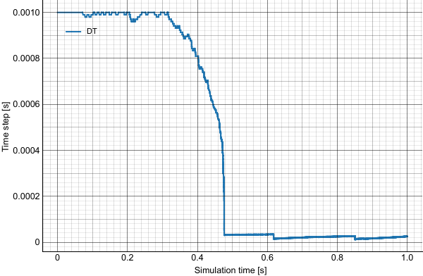 However, after changing the drag model to the default SYAM_OBRIEN I see a problem with your case. Setting fluid density to a constant value of 1000 kg/m³ the job runs to completion in a little over 13 minutes - there is a big dropoff in DT after about 0.3 seconds of simulation time - I don’t know exactly what is causing this: