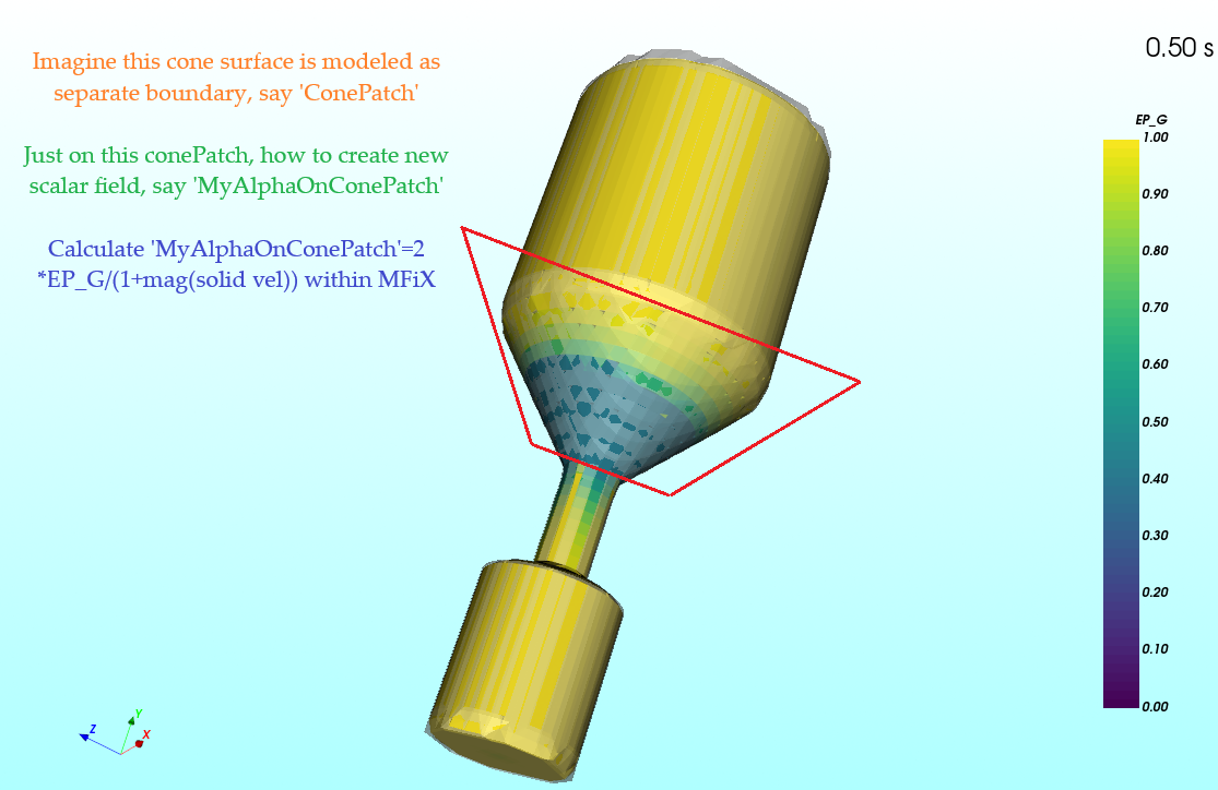 +) As shown in image, can we define new scalar field ‘MyAlphaOnConePatch’ within MFiX-TFM and visualize it under VTK tab during transient and after run? ‘MyAlphaOnConePatch‘ is simple algebraic equation in ‘EP_G’, solid phase velocity on ‘ConePatch‘.