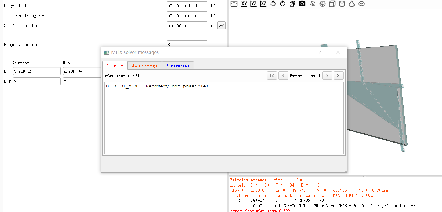 i was runing the 2d-mfix-dem,and the error message came out with dt<dtmin,and i checked all of the parameters i set up, and i don’t know why,please help.
