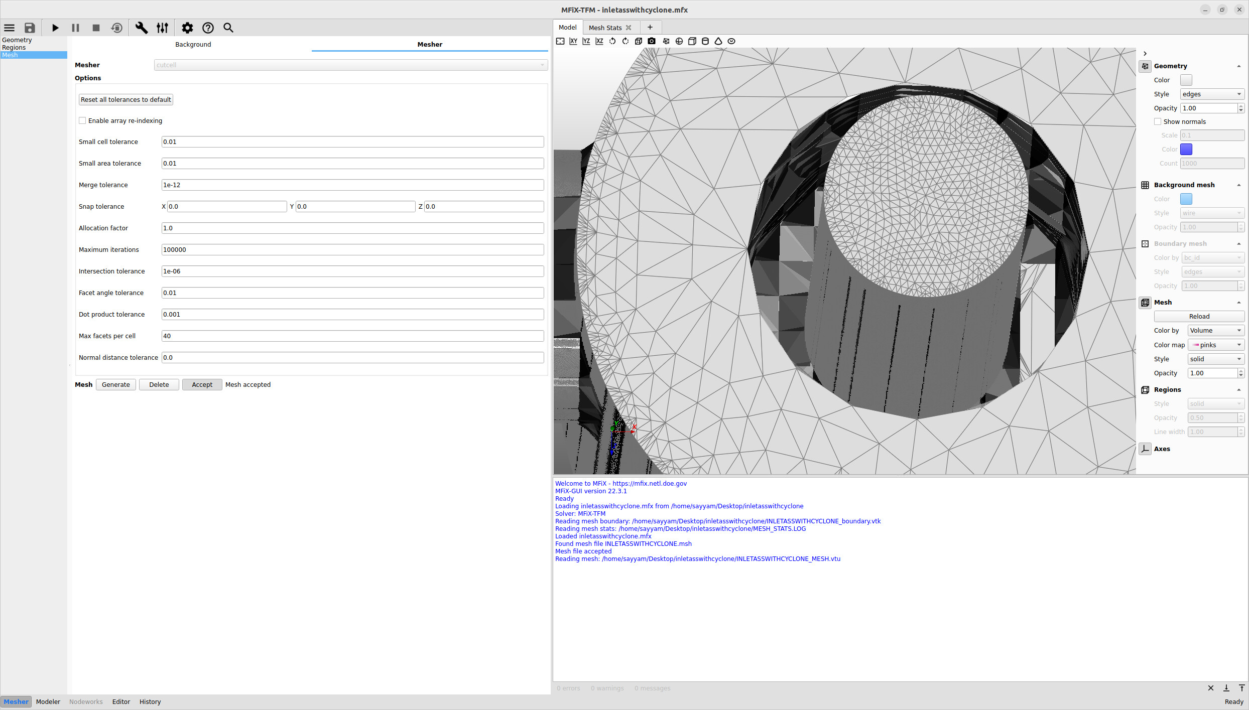 - Mesh>Mesher pane, set the normal distance tolerance to 0.01 (tol_delh)