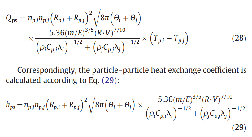 Equations 28-29 used the heat transfer coefficient between the two solid particles in the computation study and found in the article which is attached herewith.