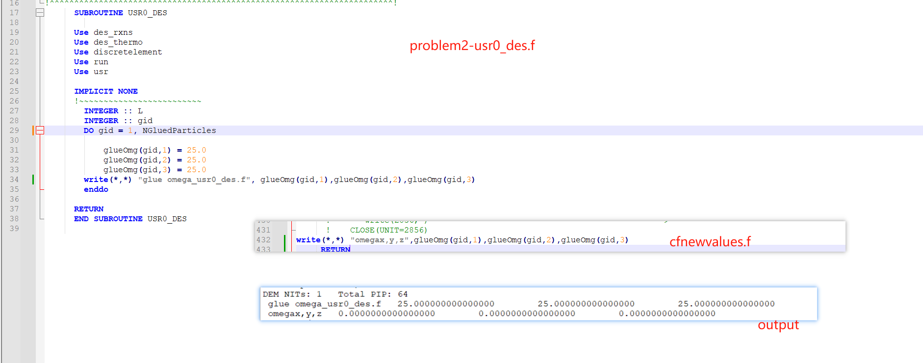 2. Since the particle_input.dat file was unable to set the initial angular velocity of the particles, I tried to initialize the initial position, velocity, angular velocity, and angular moment of the particles in the usr0_des.f file. But the angular velocity doesn’t seem to have an effect on the particles. Do you know where the mistake is?
