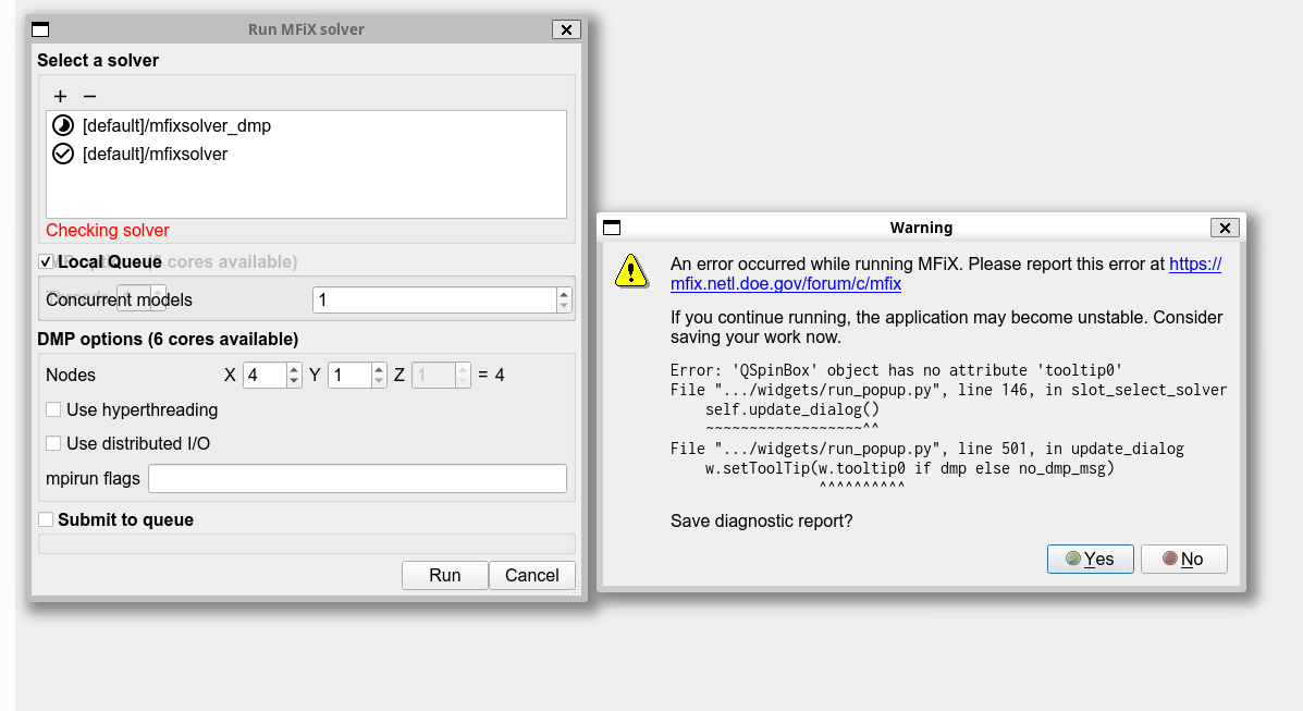 Three errors/warnings in a row are issued upon clicking the Run button in DoE. After selecting not to save a diagnostic report for each of them, the runs do start as expected, even if there seems to be some issues with the GUI and choice of local queue. So not a fatal bug, only scary.
