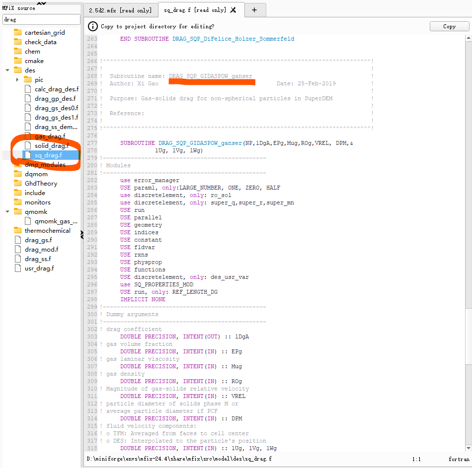 This is the first I’ve seen the DRAG_SQP_GIDASPOW_ganser subroutine. It’s not supported in the GUI, and there’s also no keyword to select this model and nothing in the solver code calls this subroutine. It’s also not mentioned in the MFiX specification. I will try to find out for you why it’s not documented or otherwise exposed to users. Are you getting good results with this drag model?