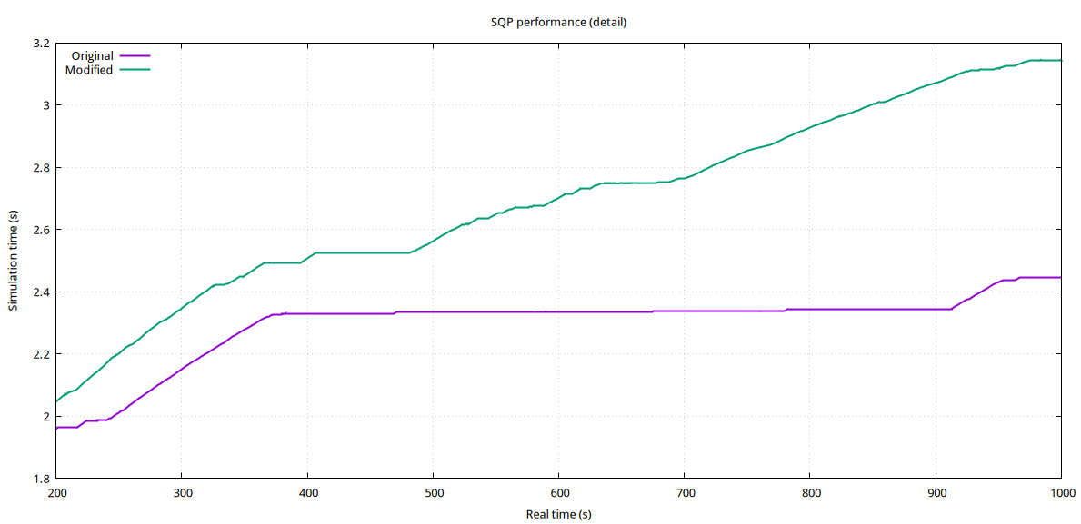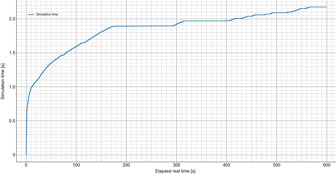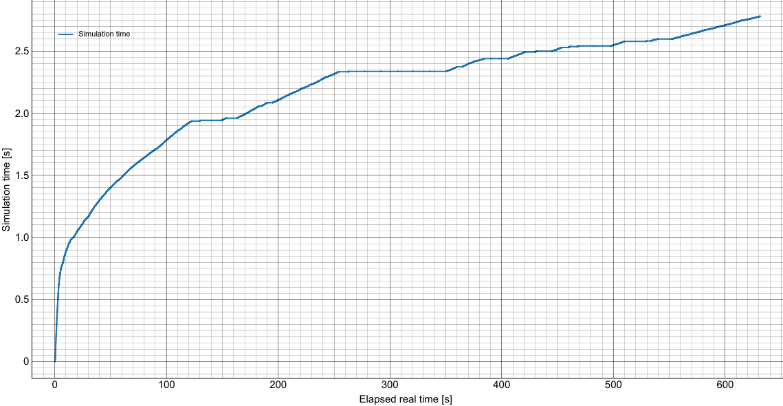 In each case, however, there are noticeable horizontal stretches on the simtime-vs-realtime plots which show the process stalling for long stretches of time - although it seems to recover.