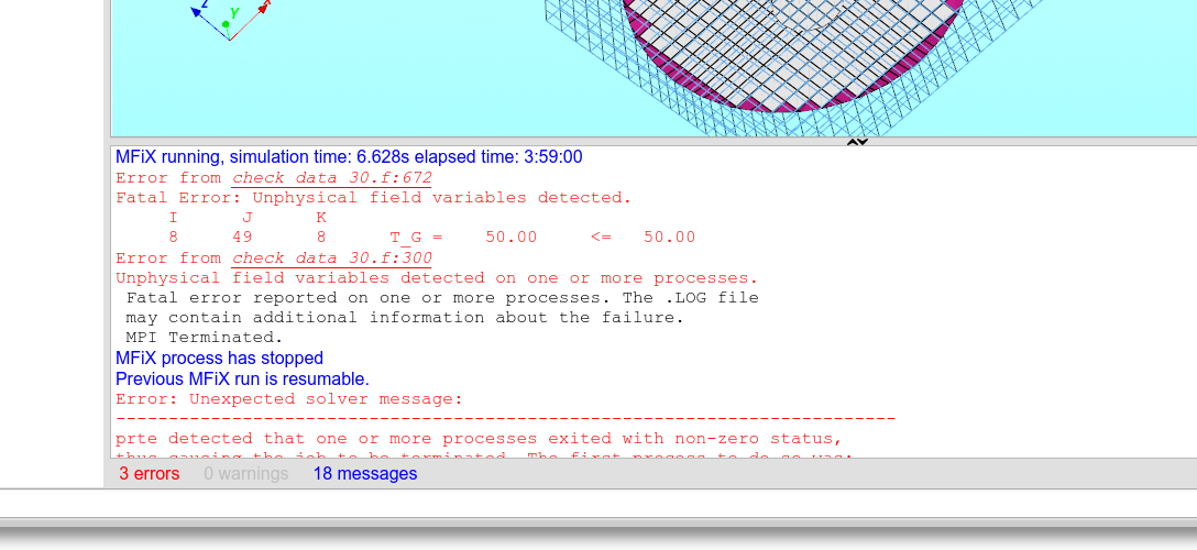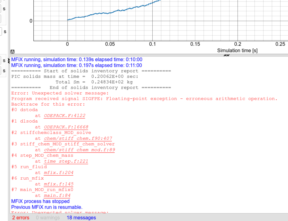 I’m trying to setup a reacting case, and looking at the silane pyrolysis example for inspiration. I have the case working already in TFM, but I face some additional challenges with PIC. But it is not so easy to see what exactly that is wrong. It runs for quite a few iterations, 11 minutes on 8 cpu, before it fails. Could it be the time step, or any other clues?