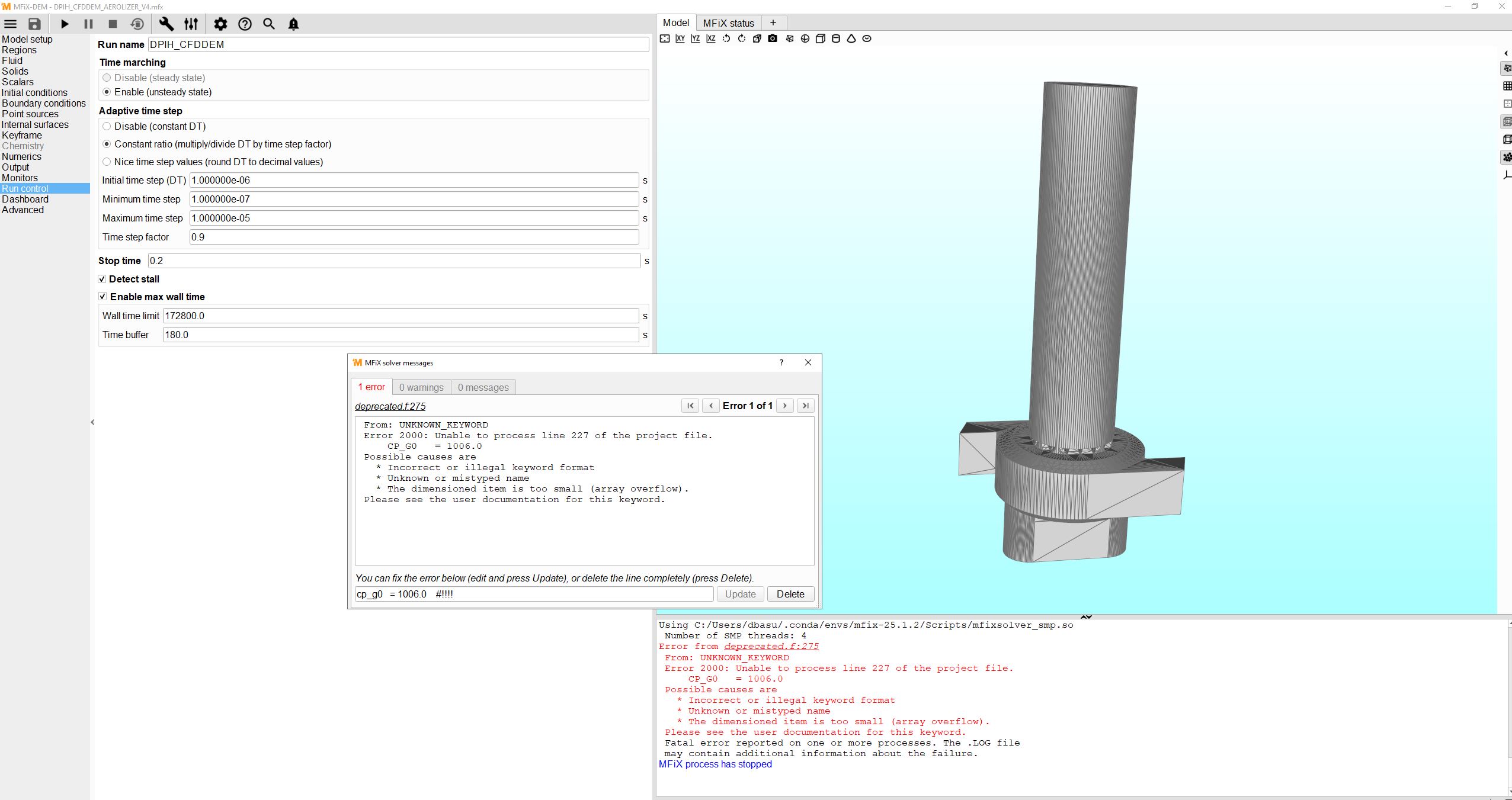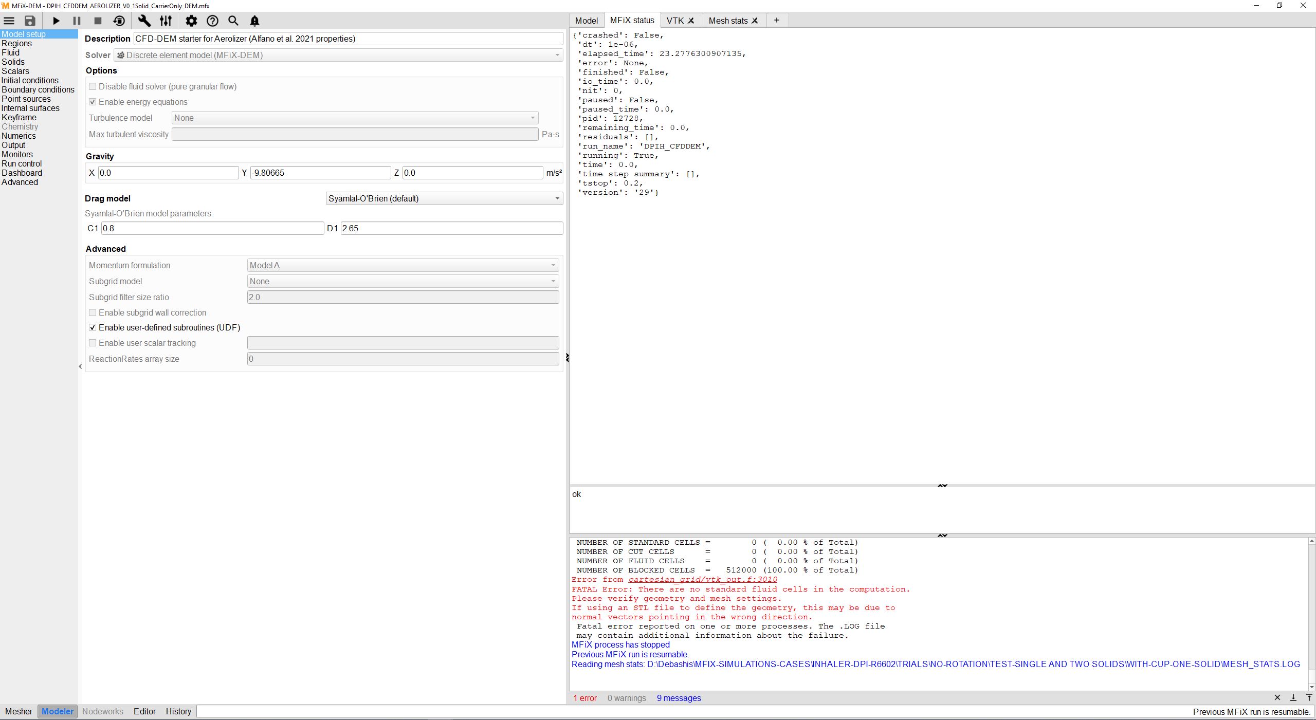 I have build a MFiX file based on the attached paper on Aerolizer and DPI. I am getting an error message when I am trying to run. Kindly have a look at the MFX file and suggest where I am making mistake. I look forward to hearing from you. Thanks and Regards,