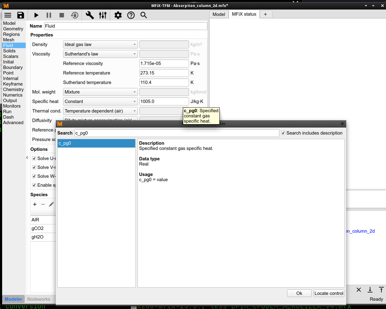B) The keyword for constant fluid-phase specific heat is c_pg0, not cp_g0. I’m not sure how you got cp_g0 in your file. (There was a bug in an early version of the MFiX GUI which set cp_g0 instead of c_pg0 but this was fixed back in 2016).
