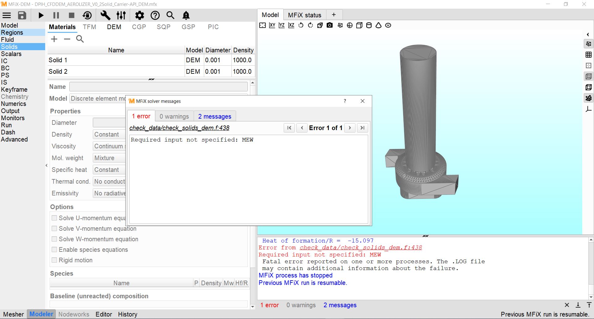 I created the file with solids. Carrier and API. It opens without any error but gives an error with MEW when trying to run. Kindly have a look at the file and let me know where is the error. Same error was seen with 1 solid as well (posted earlier). I am not sure if this is due to an older version (25.1.2).