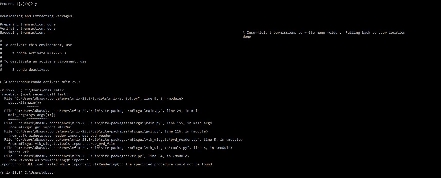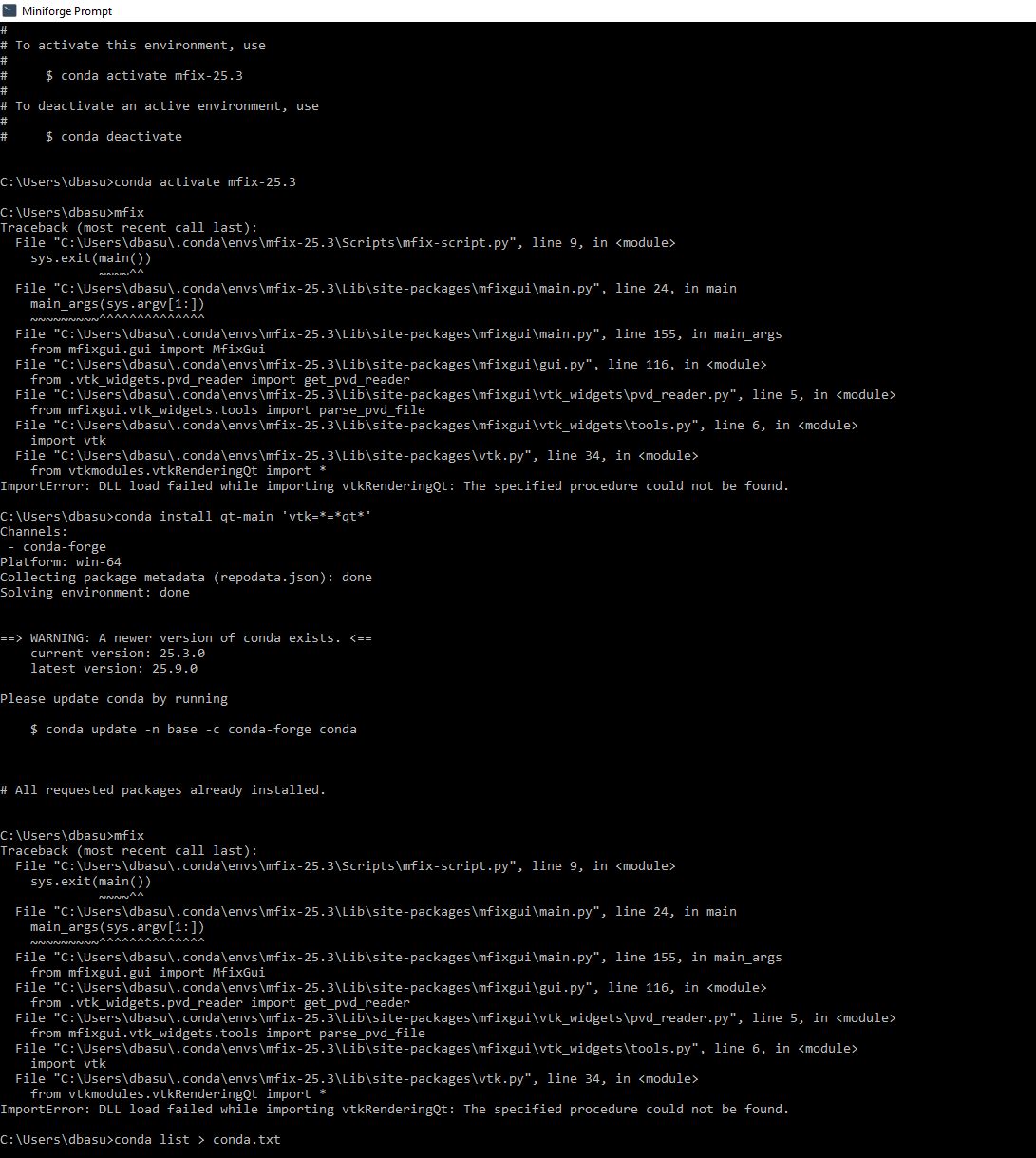 I’m looking for a solution. Since MFiX 25.3 works on my test Windows system, it’s a little hard to see what’s going wrong on yours. The conda.txt file you attached looks fine - I have the same versions of all packages and I’m not seeing any errors. It would be helpful to know exactly what DLL it’s complaing about. I’m not quite sure how to do that. I’ll try to find more information on debugging this and get back to you when I have a clearer idea of how to proceed.